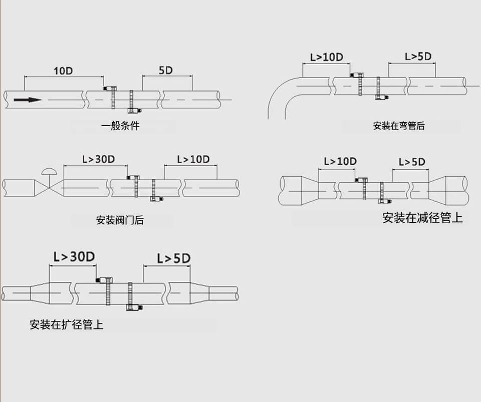 為保證流量計的測量精度,流量計附近安裝的直管段長度盡量滿足以下要求:上游>20D,下游>10D。